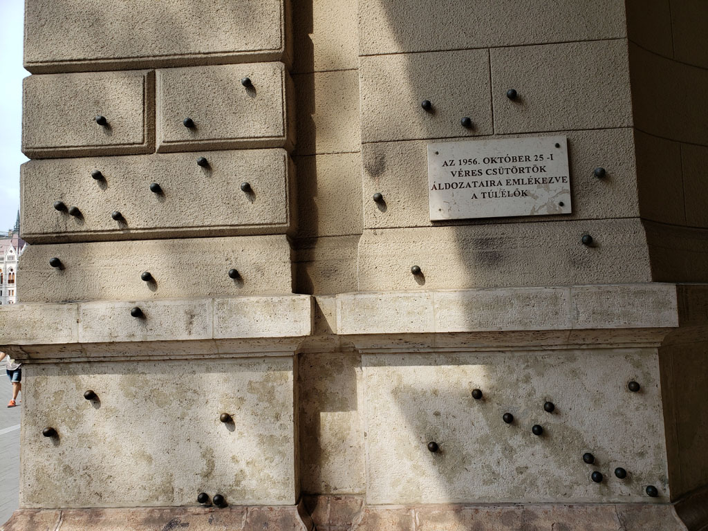 Marked bullet holes from Russian forces putting down the Hungarian Revolution in 1956. Kossuth Square. |