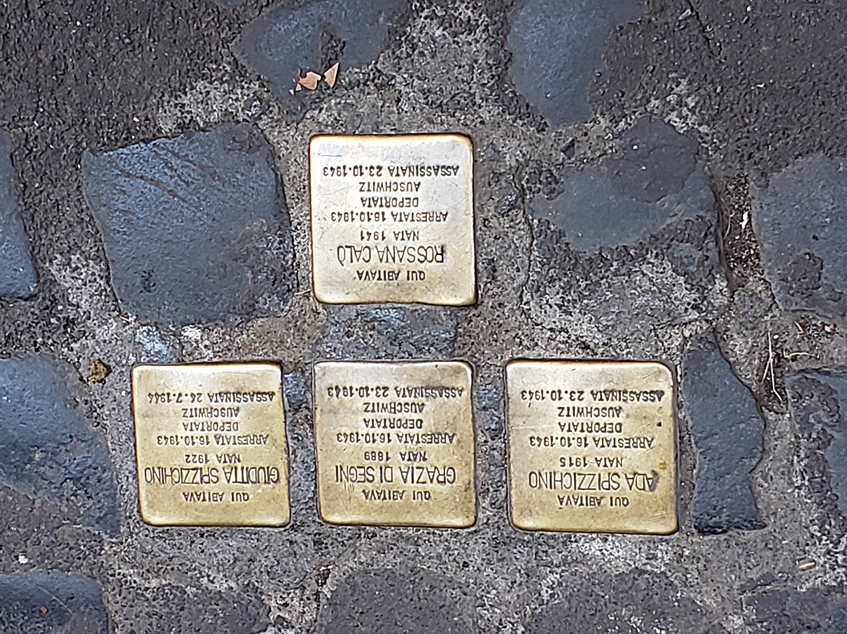 A raid on the Roman Ghetto took place on 16 October 1943. These plaques are detailed with the victim’s first and last name, date of birth, date and place of deportation, and date of death in a Nazi extermination camp. |